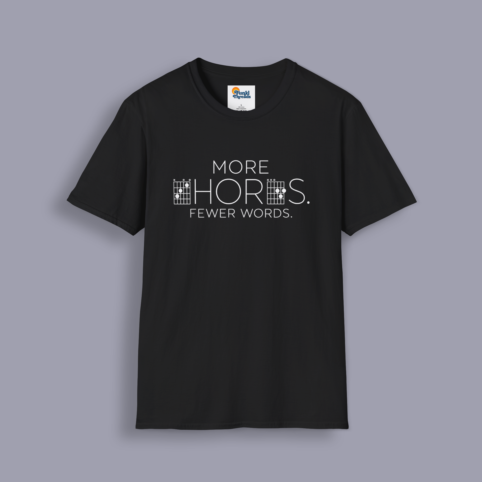 The More Chords. Fewer Words. t-shirt is for guitar players who let their hands do the talking. Featuring a minimalist design where guitar chord diagrams form part of the word “CHORDS,” this tee speaks directly to musicians who prefer music over small talk.